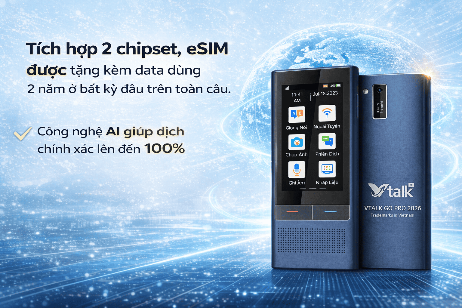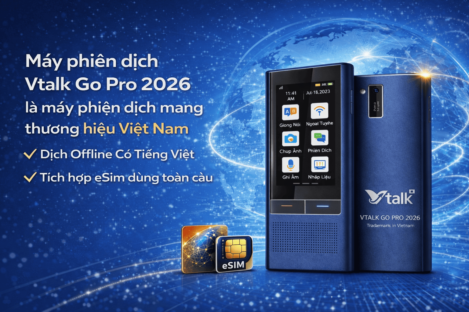 Máy phiên dịch Vtalk Go Pro 2026 là sản phẩm mang thương hiệu Việt Nam, là mẫu độc quyền duy nhất thị trường đáp ứng nhu cầu phiên dịch tiếng Việt ngay cả khi không có kết nối mạng (dịch offline) và tích hợp eSIM dùng trên toàn thế giới mà không cần lắp sim hoặc kết nối wifi.