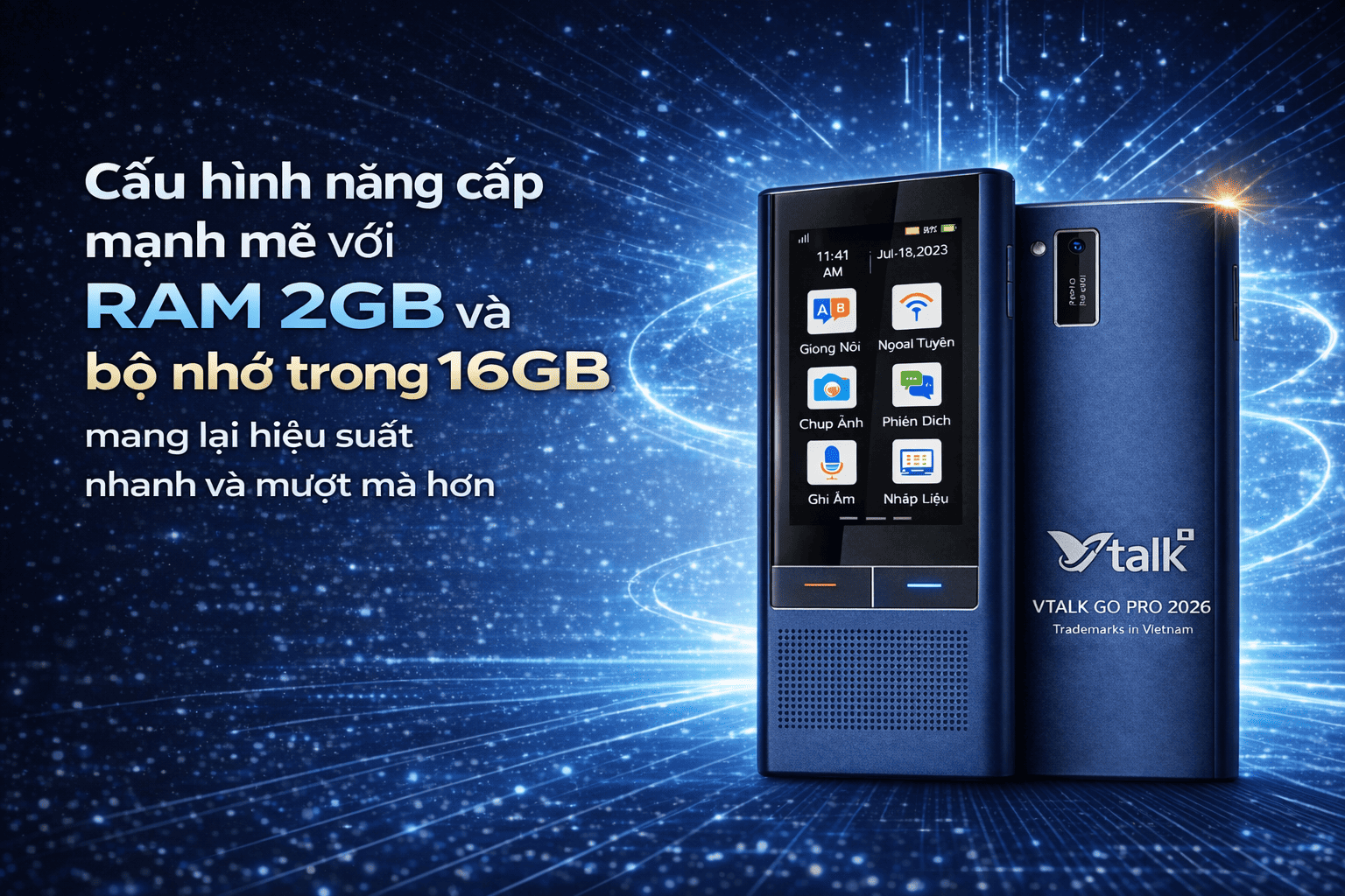 Máy phiên dịch Vtalk Go Pro 2026 được trang bị cấu hình nâng cấp mạnh mẽ với RAM 2GB và bộ nhớ trong 16GB, mang lại hiệu suất nhanh và mượt mà hơn trong quá trình sử dụng. Việc nâng cấp này giúp máy xử lý các tác vụ dịch thuật nhanh chóng, hỗ trợ dịch trực tuyến 138 ngôn ngữ, dịch offline có tiếng Việt, và dịch hình ảnh đa ngôn ngữ một cách hiệu quả.